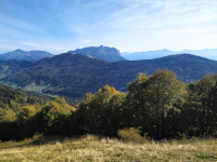 En haut, très belle vue à 360°, en particulier sur tout le massif des Bauges et le Mont Blanc :- Ce dernier pointe le bout de son sommet au dessus de l'Arclusaz.